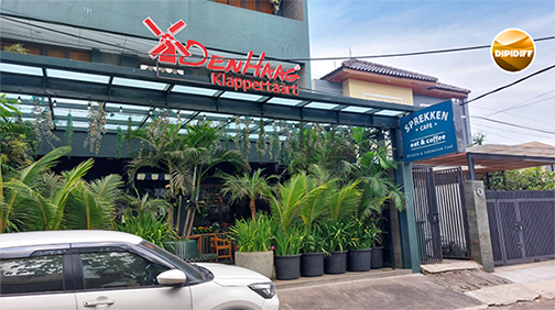 Ternyata bangunan Sprekken Cafe ini menyatu dengan hotel Bangreng Inn, dan menurut penjelasan teman saya, cafe ini dulu lebih dikenal karena menjual klapertart yang enak di Bandung. Entah kapan akhirnya menjadi Sprekken, tapi nama Denhag Klappertaart masih tampak jelas di bagian atas gedung.