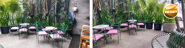 Begitu tiba, kita langsung berhadapan dengan ruang teras yang hijau pot tanaman hias, lalu menyusul kursi-kursi mungil berwarna pink. Kalau pagi sepertinya nyaman di sini, entah kalau siang mungkin lebih pilih di area dalam yang ber-AC.
