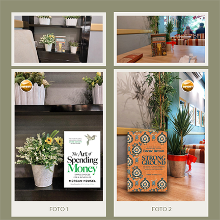 Waktu itu saya sedang membawa buku Days at Morisaki Bookshop, saya letakkan buku itu dalam proposi berdiri dengan angle foto eye-level. Bukunya saya dekatkan ke sebuah pot bunga hias seperti pada gambar di bawah ini. Lalu saya edit fotonya di aplikasi Snapseed dengan filter POP 1x. Lalu file editan saya lempar lagi ke aplikasi Photolayer dan timpa bagian cover buku dengan file sampul buku Morgan Housel yang baru, judulnya The Art of Spending Money. Pilihan buku ini karena kombinasi warnanya yang putih cerah, ada hijau pada judul, yang saya yakin akan tampak cantik di latar abu-abu rak, dan pot putih berbunga kuning itu. Terakhir saya beri logo Dipidiff. Sesederhana itu. Hasil bisa dilihat di bawah ini.