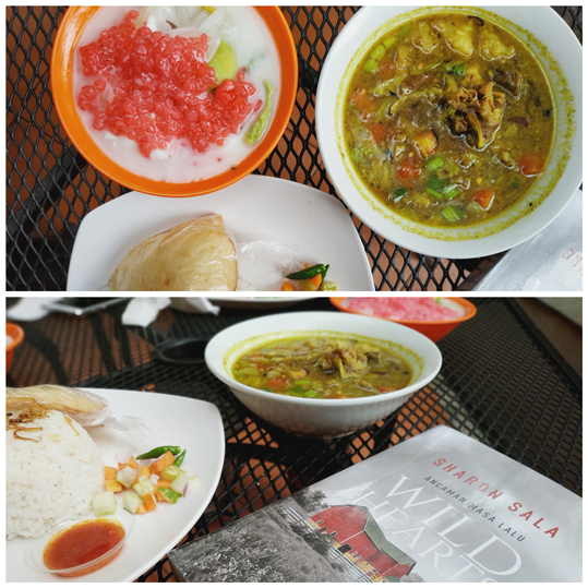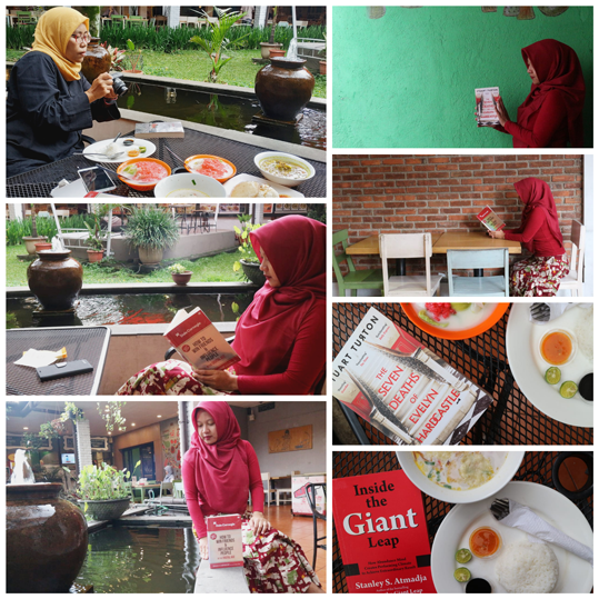 Siang ini saya pilih menu nasi lengkap dan es campur. Tempat duduknya pilih yang dekat kolam ikan karena mencari lokasi yang adem dekat gemericik air. Rasa soto dagingnya sebenarnya enak dan bumbunya terasa, hanya tekstur dagingnya menurut saya kurang lembut. Anehnya soto yang dipesan bu dini dagingnya empuk. Kami memang beli di tempat yang berbeda. Es campurnya enak, manisnya pas, dan dinginnya juga cocok karena suasana siang sedang terik-teriknya. Menu-menu yang tampilannya menggugah selera ini sempat dijadikan latar juga oleh bu Dini untuk foto buku.