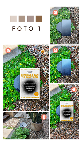 Saya atur posisi tab sehingga membentuk pola yang rapi dengan latar rumput, ujung batu, dan kerikil yang ada. Hasil foto bisa dilihat pada gambar 2. Saya edit foto ini di aplikasi Snapseed dengan filter Accentuate 1x dan POP 1x (gambar 3). Saya edit lagi di applikasi PhotoLayers. Saya timpa bagian tab dengan cover buku Reaching Down The Rabbit Hole. Saya pilih cover ini karena warna latarnya yang terang dan kontras, warna kuning terang pada judul akan memberikan kombinasi yang sesuai untuk warna rumput yang hijau terang. Saya atur Shadow - Opacity dan Shadow - Offset YÂ dan Color-Brightness, Color-Contrast, dan Color-Saturation (gambar 4). Lalu saya tambahkan logo Dipididiff. Hasil akhir bisa dilihat di gambar 5.