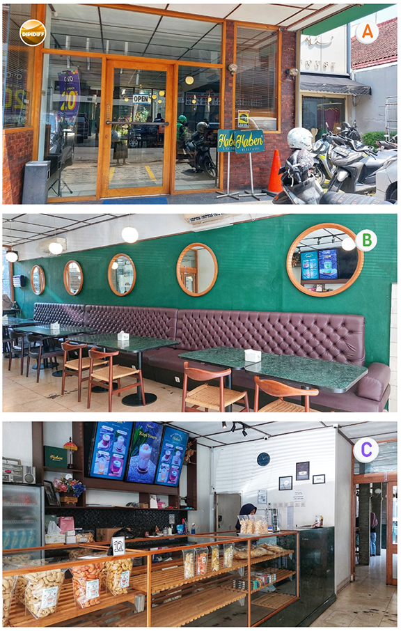 Bangunan Haben sedang saja. Di sini ada area indoor dan outdoor. Kelihatannya peruntukannya untuk smoking dan non smoking. Begitu masuk dari pintu depan (a), ada ruangan tertutup dengan kursi sofa dan meja panjang (b), dan meja dengan kursi-kursi kecil (d). Ada etalase dan meja order (c), tapi kopinya sendiri dibuat di ruangan belakang dengan satu space khusus barista.