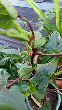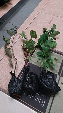 - Aktivitas: Repotting, memindahkan tanaman rosela ke pot yang lebih besar. Menyiramnya dan meletakkan kembali ke tempat yang cukup terkena sinar matahari. Setelah proses repotting terlihat sedikit layu sehingga dibantu ikat dengan tali di kayu penyangga.