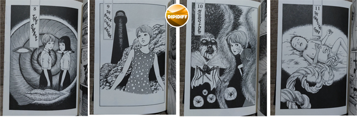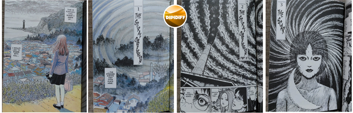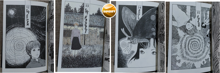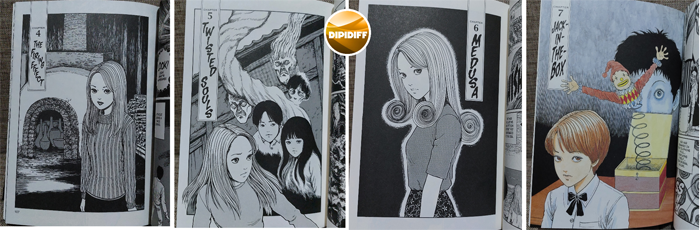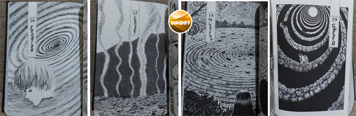 Kisah-kisah yang paling mencekam, menjijikkan, dan berkesan buat saya adalah Jack in The Box, The Snail, Mosquitos, dan Umbilical Cord. Gambar manganya jelas vital dalam membangun mood cerita. Tapi bukan hanya gambarnya yang mengguncang, tapi ide ceritanya juga absurd dan berbeda. Totally disturbing me. Begitu membaca chapter behind the scene saya baru tahu kalau Junji Ito memang sempat memelihara siput dan mengamati pola-pola spiral saat mengonsep cerita kutukan ini. Hal menarik terletak pada tension cerita yang makin lama makin mengganggu dan pola kutukan spiralnya kini sudah tidak hanya menyebabkan tingkah laku penduduk kota menjadi aneh dan mengerikan tapi lingkungan kota kini juga sudah menunjukkan berbagai kengerian seperti badai dan tornado yang aneh.